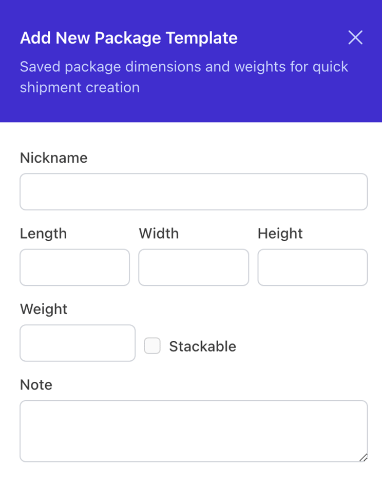 All fields are optional except the template name. You can leave dimensions blank if you want to enter them when creating a shipment.